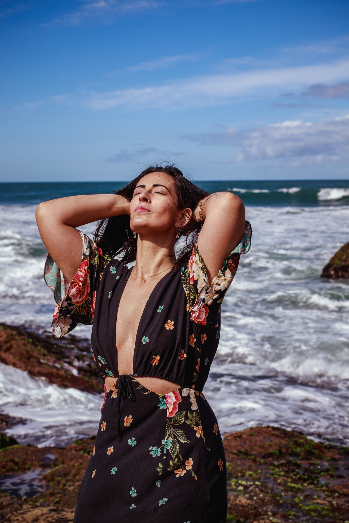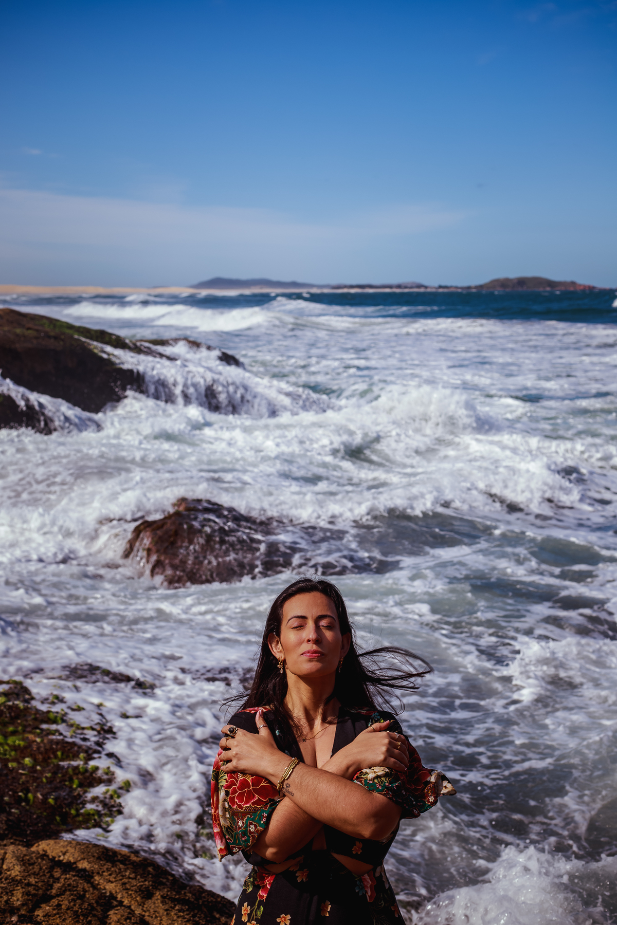 Estávamos esperando o mar se aproximar de onde a Michele estava sentada, mas ao mesmo tempo eu estava prezando pela segurança, com medo de que a água chegasse com muita força e a Mi recebesse uma esfoliação gratuita da natureza!